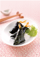 4 先將左、右兩側的海苔,分別往內折,整形,包緊,沾點美乃滋黏住海苔交接處。