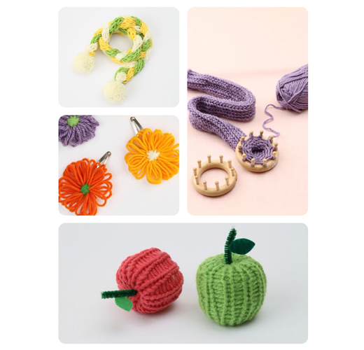 原木編織器3個、編織手冊1本、毛線1捆(紅、紫、粉紅三色隨機出貨)