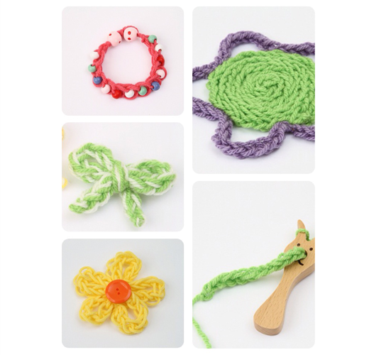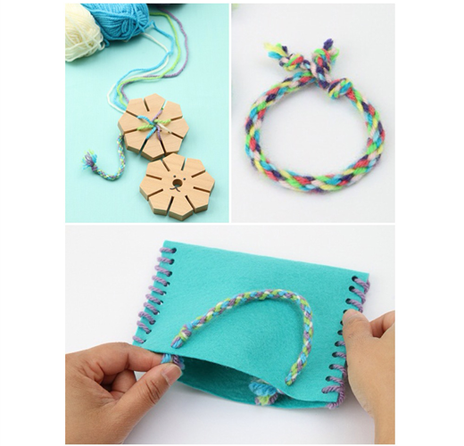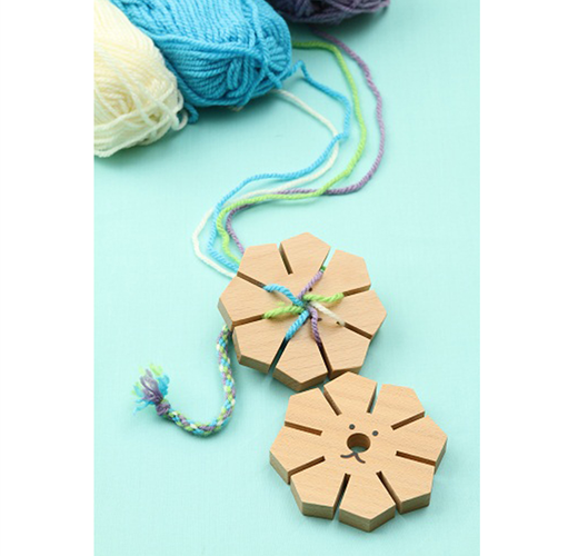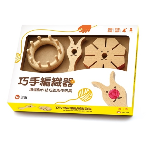 「巧手編織器」含有三種編織器,讓孩子有多樣的編織體驗。天然櫸木材質、可愛的動物造型,適合幼兒抓握。兔子編織器可以織成項鍊、手環、花,獅子編織器為手環編織器,透過簡單的規則就可以編出手環,圈圈編織器可以編出筒狀的作品,做出圍巾、花和針插等。