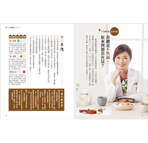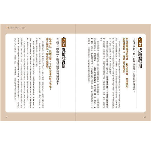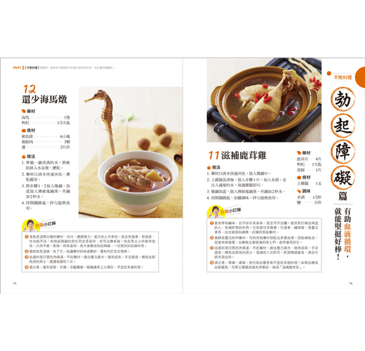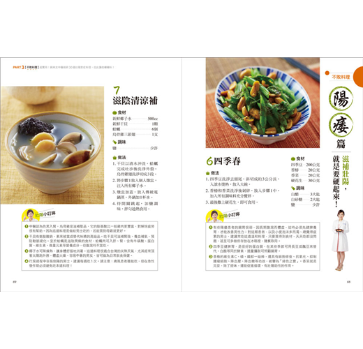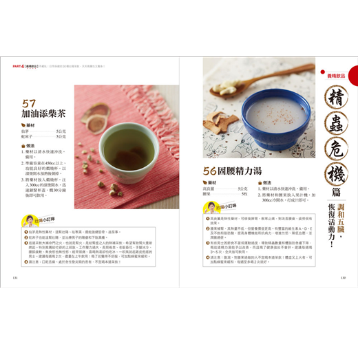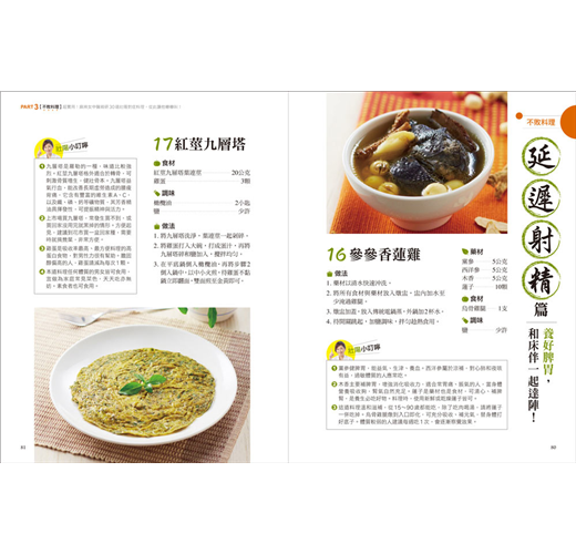 中醫講究「藥食同源」,所以鄒醫師以中草藥學為本,針對男性最常求助的「早洩、陽痿、勃起困難、延遲射精、性慾低下、精蟲危機」等6大問題,擬出30道藥膳料理食譜,除詳列食材分量、說明藥材特性,並有清楚的示範步驟,非常方便居家烹煮享用;此外,也顧及上班族需求,特別設計出30款藥用茶飲,隨時可沖泡飲用──全書囊括60道「壯陽大補帖」,好吃好喝又有效,從此上床不NG!