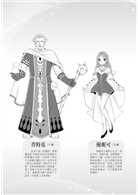 在偌大的雪白庭院前,一名女子身穿七彩錦緞,長袖隨著風吹過而微微飄起、亮白色的裙襬稍稍拖著地、胸前的項鍊如同自身多彩的瞳孔一般,閃爍著不同種顏色的光,而其淡金色的頭髮綁成麻花捲垂掛在左肩與胸前,顯得氣質出眾。