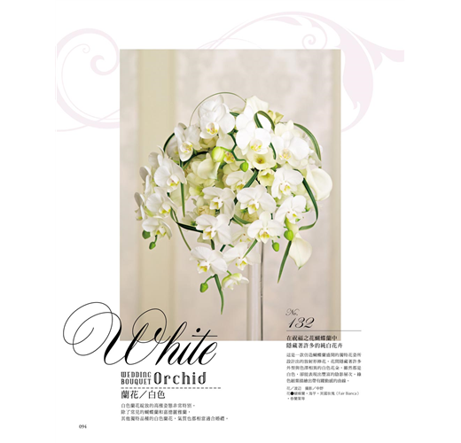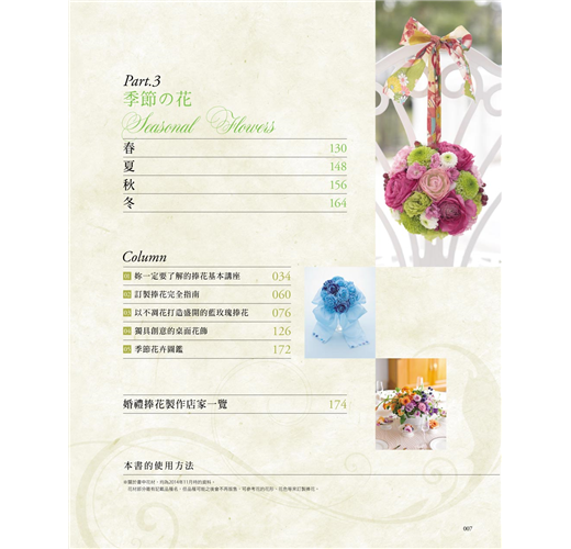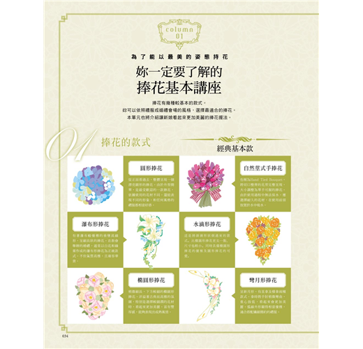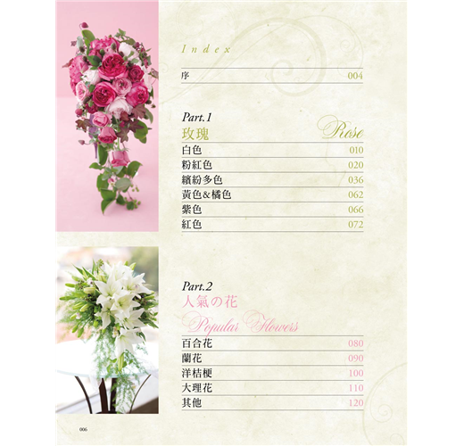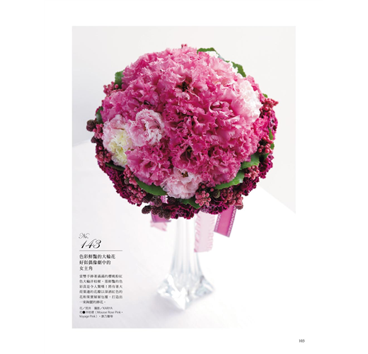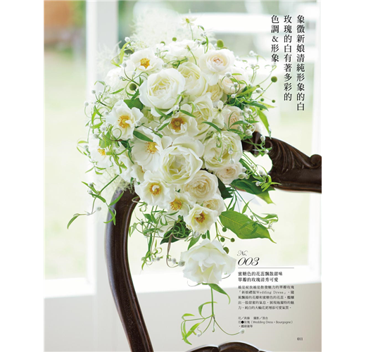 書中介紹247款超高人氣的新娘捧花,從各種顏色的玫瑰、非常受歡迎的百合、蘭花、洋桔梗等常見花卉,還有不同季節可選用的當季花卉……可以依照圖片採購花材,或是以此為範例向花店訂購。就讓這一束花成為美麗新娘未來最美好的記憶之一吧!