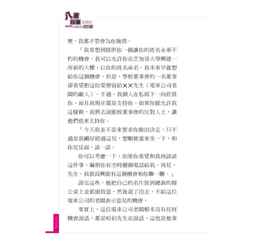 說完,他拎起皮包就走出了談判廳,躲到別的辦公室看報紙去了。半小時以後,中方一位代表跑來報告好消息:「董事長說了,快請你回去。他們強烈要求迅速徵用港口的場地……」接下來,談判進行得非常順利。