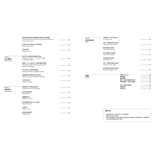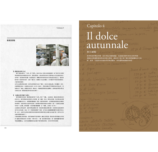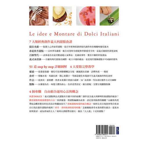 何謂DOLCE?義式甜點與法式甜點有什麼不同的結構?創作富含義大利鮮明性格甜點的秘訣?構思甜點與靈感發想的方法?找到靈感,將甜點編織為故事,設定食用族群的關鍵?以顧客角度帶給品嘗者驚喜的色彩設計與擺放技巧?搭配甜點味覺的統合概念?如何完美呈現食材契合度並自行找出製作甜點的規則?香草、香料與酒的使用時機?怎麼跳脫香草水果的慣有組合,從基本原則嘗試,成為香氣的主人?如何以酒精帶出層次,做出「大人感」十足的甜點?