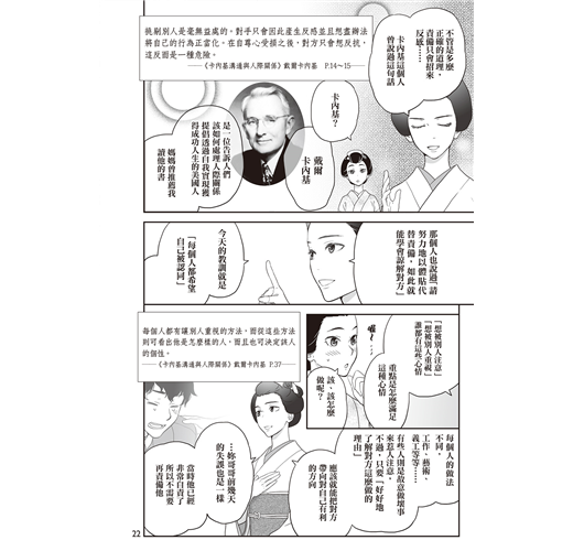 「其實對這本第一印象是雖然是漫畫,卻好像蠻多字的,不知道讀不讀得下去?意外地非常易讀,內容也很充實,『原來原作裡有寫到這麼好用的資訊?』真是讓我驚訝。故事自然,畫風也很漂亮,最重要的是內容真的太優秀,對原作只讀了一次的我來說,這本漫畫就算讀7次10次也沒有問題。讓我體認到自己在待人接物上顯得傲慢、沒有原則,讓我想改變的一本書。」
