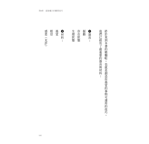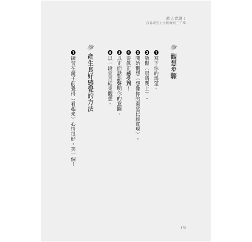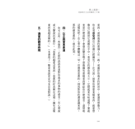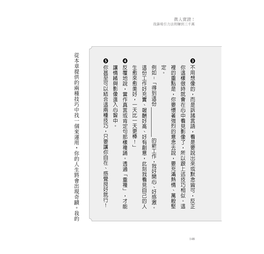 他強調,要讓「吸引力法則」在你的生活中發揮它該有的作用,你需要的並不是再多讀一本書、再多聽一場講座、再多報一個課程,而是「百分之百照著做」。然後,他在書裡面幫你整理出你可以照著做的「食譜」。