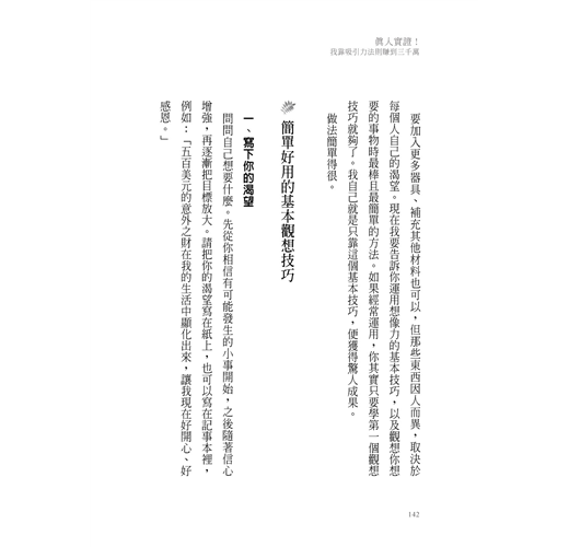 有一天,他終於發現自己(和那些知道吸引力法則卻沒能成功的人)問題出在哪裡:看了書之後備受鼓舞,然後從裡頭挑一兩個方法來用(或只是「備受鼓舞」,連做都沒做),卻沒有真正照著書中的方法一步一步執行;這很可能是因為大部分的書都講太多概念、太艱澀了,讓人失去執行的意願。