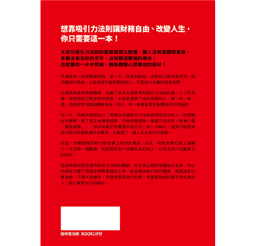 因為領悟到成功運用吸引力法則的關鍵,在於真正按照步驟指示去做,所以他將自己看了那麼多相關書籍的心得,結合親身執行後的體會,寫成這本化繁為簡,不講太多概念,多提供實用技巧的書,希望幫助始終看不見成果的人,踏上確實可行的路。