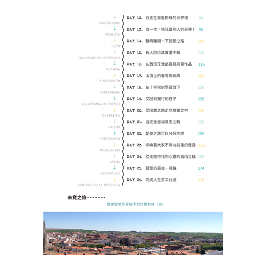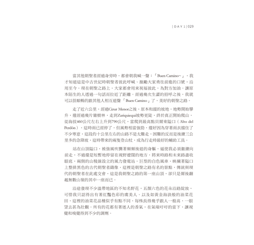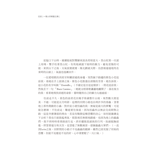 獨自一個人走上朝聖之路,自東向西,橫跨西班牙的北部,雖然最終沒走完全程,為何沒走完,日記裡頭我有交代。不過,徒步六百多公里的經驗,成功完成體能與意志的最大挑戰,已經在我生命中留下清楚的印記,所餘下的兩百公里遺憾,未來有機會我會再去嘗試。