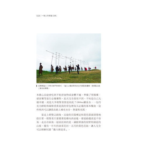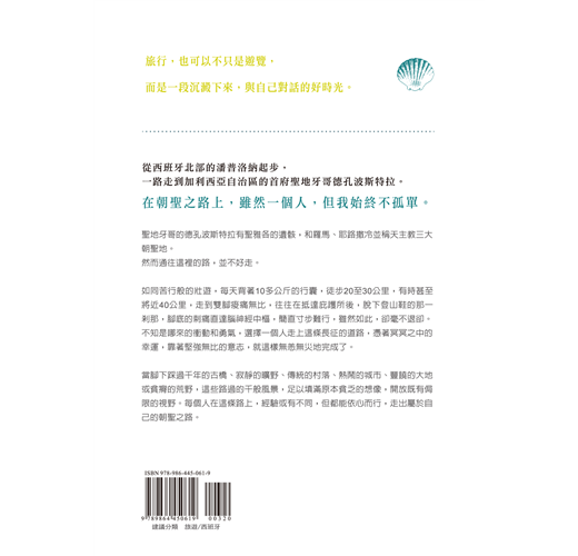 聖地牙哥的德孔波斯特拉有聖雅各的遺骸,和羅馬、耶路撒冷並稱天主教三大朝聖地。然而通往這裡的路,並不好走。如同苦行般的壯遊,每天背著10多公斤的行囊,徒步20至30公里,有時甚至將近40公里。然而一路踩過千年古橋、寂靜曠野、傳統村落、熱鬧城市、豐饒的大地或貧瘠的荒野,這千般風景,足以填滿原本貧乏的想像,開放既有侷限的視野。每個人在這條路上,經驗或有不同,但都能依心而行,走出屬於自己的朝聖之路。