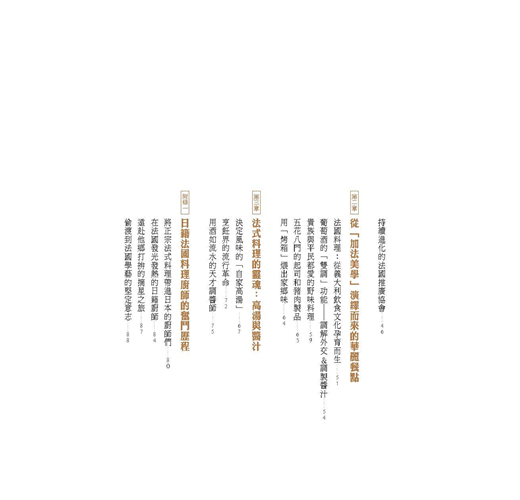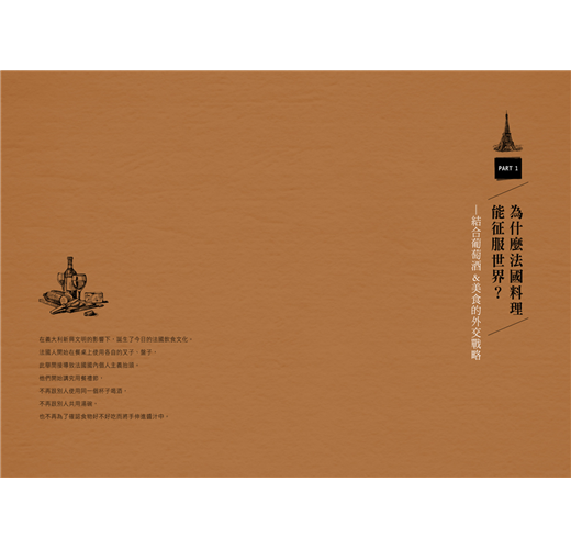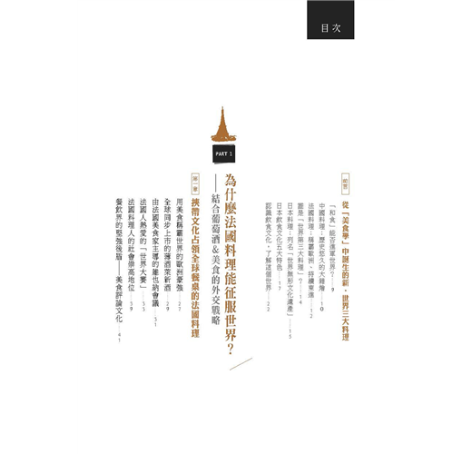 從葡萄美酒的釀造、濃郁醬汁的燉煮,到充滿庶民特色的野味料理,法國料理無一不伴隨著風土民情與文化的醇厚滋味。當「薄酒萊新酒」、「米其林餐廳」成為全球食客競相追逐的對象時,法國正在將她的美食與文化同時輸出,進行侵略全球的「國家戰略」……