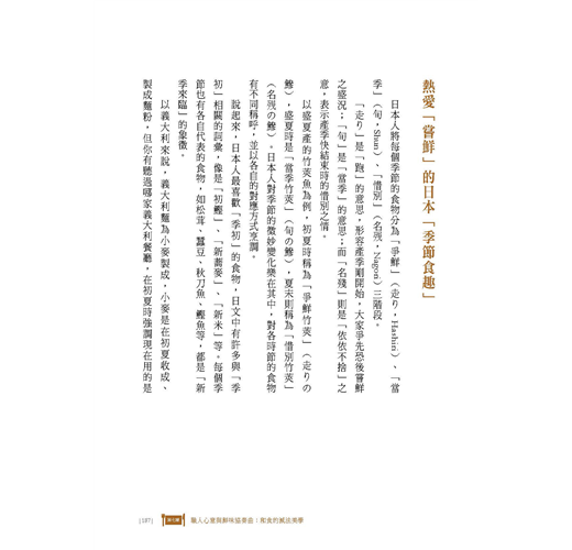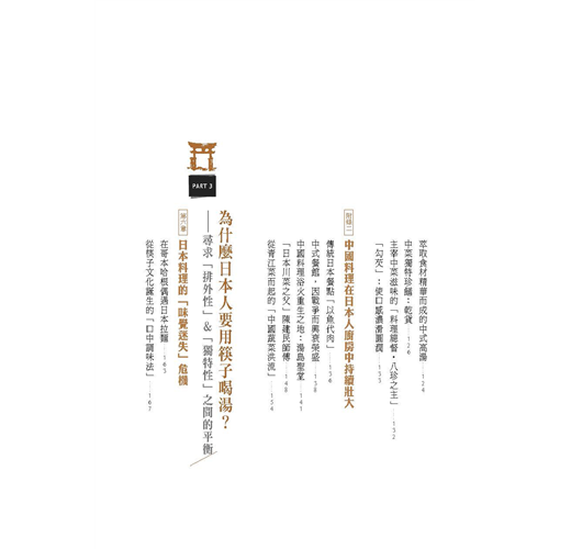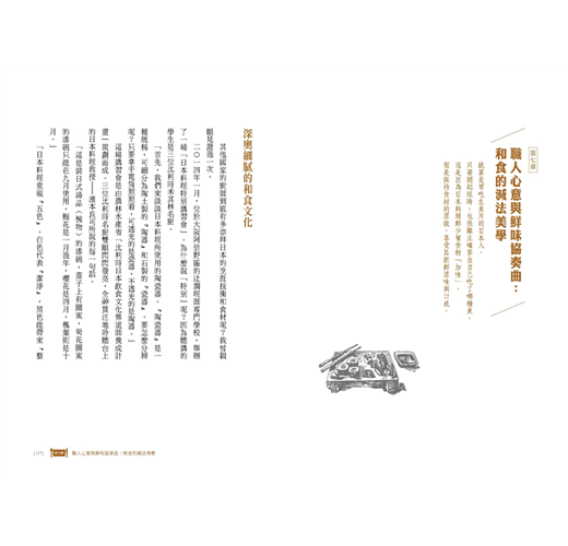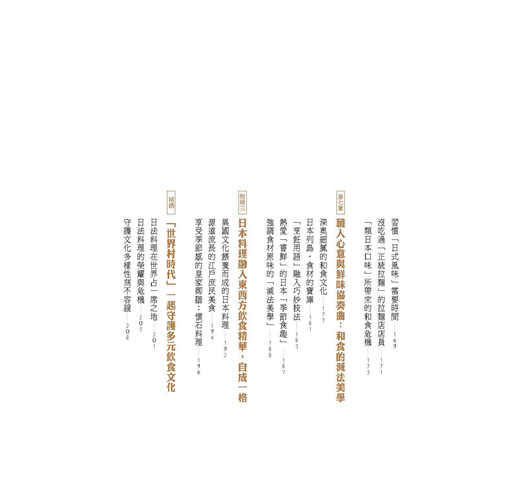 本書的第三部分,將分享日本料理的魅力與祕密,介紹日本人以食物反映季節、驚人的飲食巧思;以及目前世界上日本料理的實際狀況及遇到的難題。
