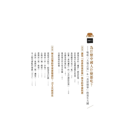 「四隻腳的,除了桌子都吃!」一句話點出中國人有多愛吃。中國菜食材五花八門,著名的「鮑參翅肚」之外,各地還有自己的特色菜餚──都遵循「以形補形」、「養身益氣」的大原則。更因地廣人多,有麻辣川菜、甜辣上海菜、結合西洋風味的廣東菜,以及重鹹的北京菜。與此相應的,是細緻的刀工與火候技巧,怎麼切、切多大都是門學問;就連下油鍋幾秒,都得精準控制。