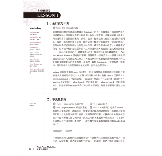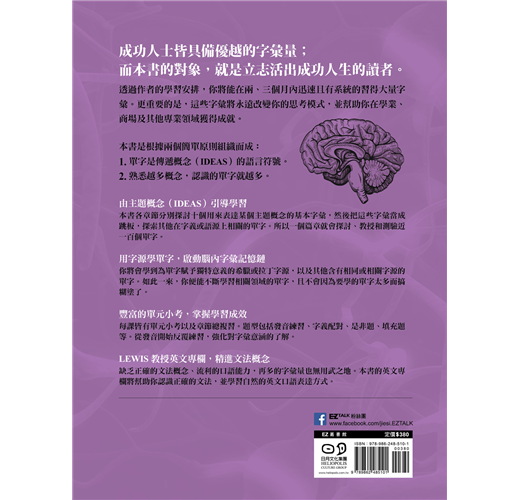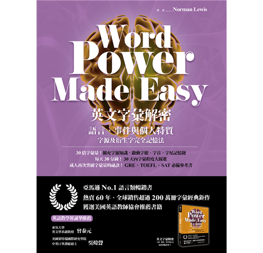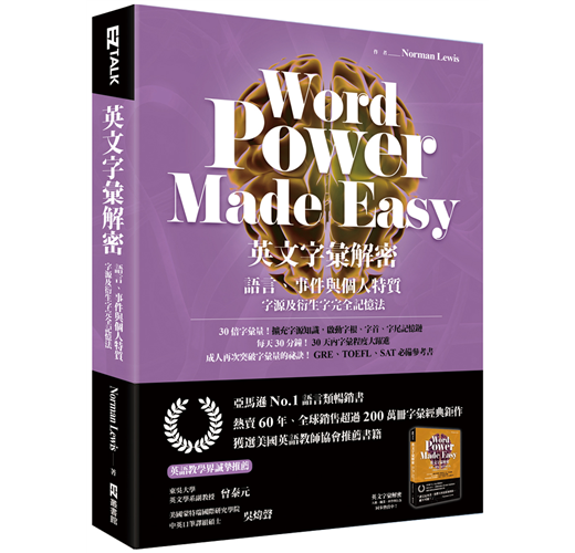 本書作者Norman Lewis為英語文法及語源權威,結合其豐富的教學經驗及語言學專業著成本書,以幫助讀者在兩、三個月內,迅速且有系統的習得大量字彙、將它們納入長期記憶中,並在口語及寫作中自然的使用。更重要的是,這些字彙將永遠改變你的思考模式,增進個人表達及對世界的理解能力。