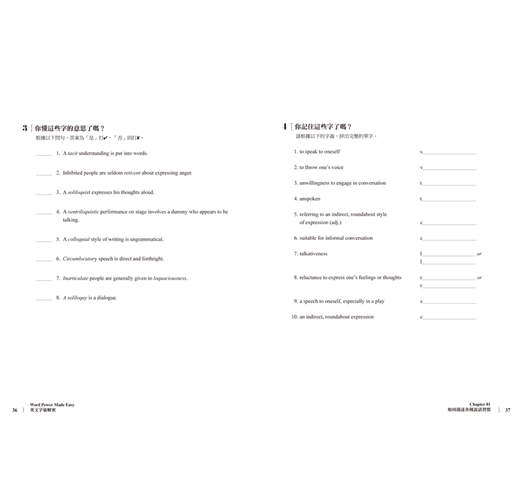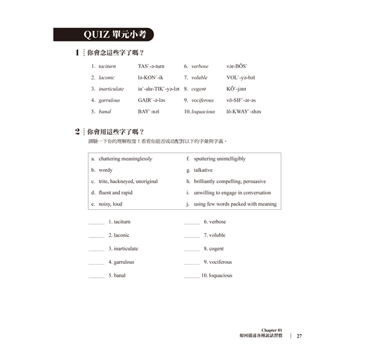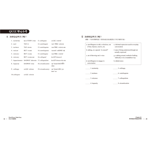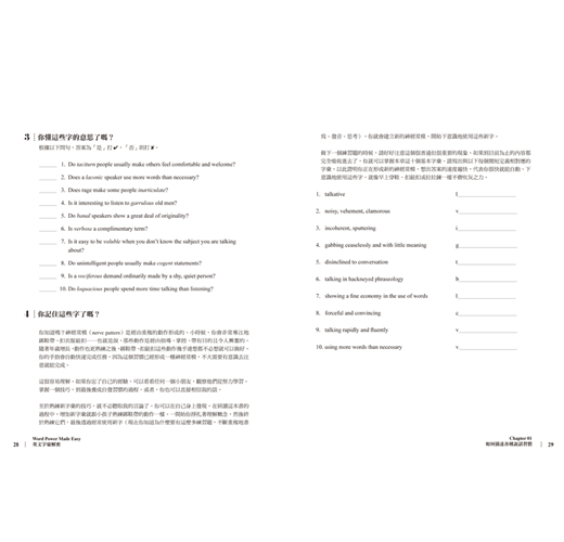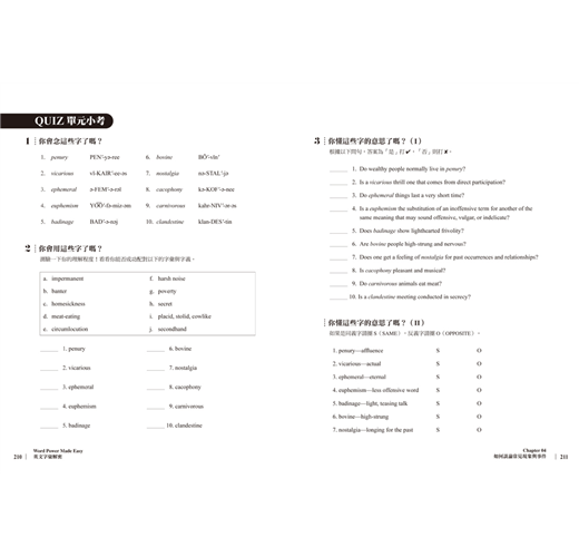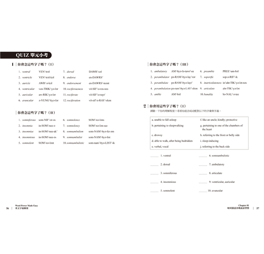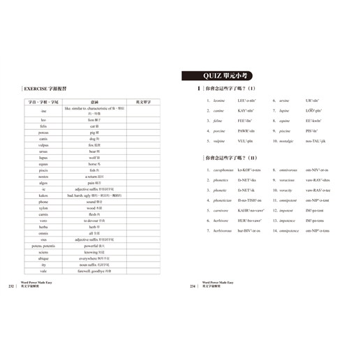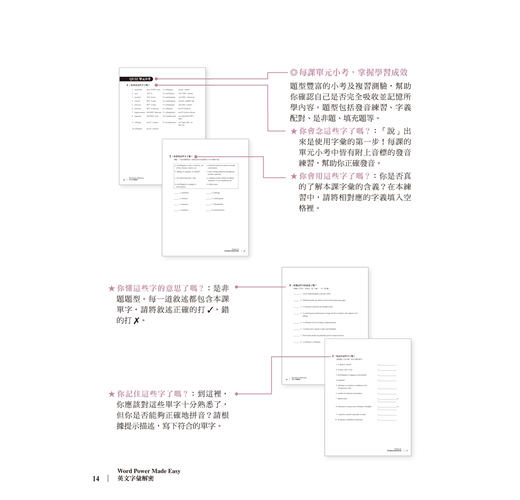 每一單元皆附有發音練習、字源練習等實用測驗題,幫助讀者將單字納入長期記憶中,並隨時掌握學習成效與進度。此外,收錄作者Norman Lewis的學習建議,記憶字彙將更有方法和效率。
