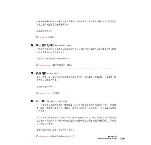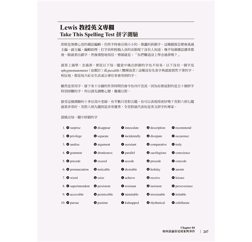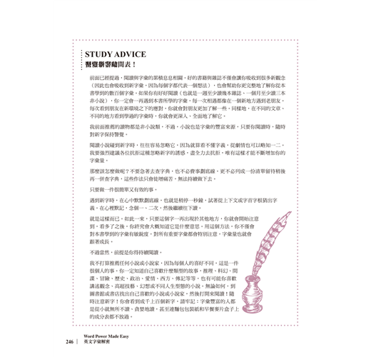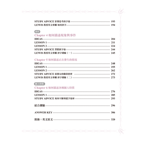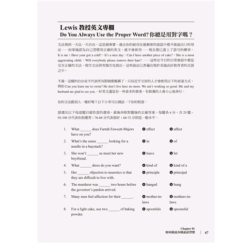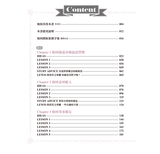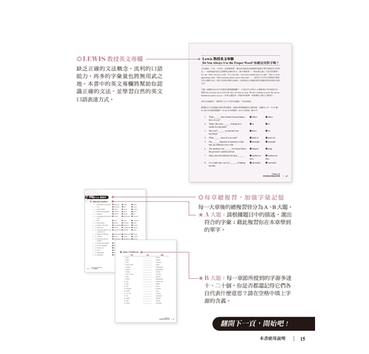 缺乏正確的文法概念或流利的口語能力,再多的字彙量也將無用武之地。本書中的「Study Advice」和「Lewis教授英文專欄」,將幫助你認識正確的文法,並學習自然的英文口語表達方式。
