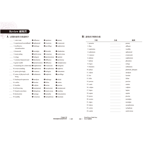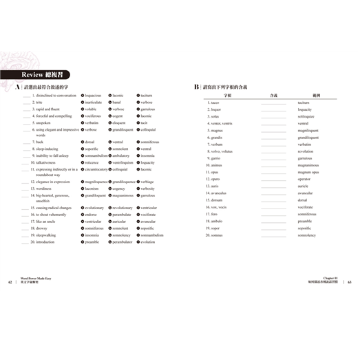 要特別注意「總複習」,其中列出的單字你是否還記憶猶新?前面章節所提到的字根含義是否都還記得?在這些複習中,要測驗的不僅是你的學習狀況,也要找出並加強你的不足之處、弱點或記不牢的地方。