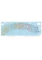 每個情境中都會出現五彩繽紛的小鳥,牠們努力揮動翅膀,帶著小羊飛往蔚藍天空,也指引出蒲公英飛行的方向,可說是最佳導遊。隨著小鳥們出現次數的減少,似乎暗示著小羊們離開安全舒適的圍欄草原更遠了。小羊們一路結交生活在不同環境的小動物朋友,看到蒲公英從種子發芽、成長茁壯、飛上天際……受到了鼓舞,再勇敢的回到家園。