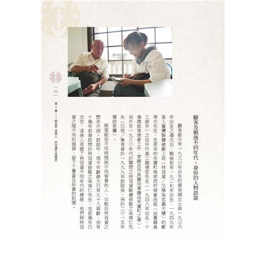 解讀完日治時期,另一個高難度是關於戰後的使用單位的部分,軍方資料取得困難,臺鹽公司本身對於忠義大樓(林百貨)記錄並不多,南區糧食局的部分,多次打電話洽詢資料一直沒有回覆;而最後離開的保三總隊則因時間久遠、人員退休,幾乎斷了所有的線索,只能從臺灣鹽業檔案、臺灣行政長官資料檔案、省議會檔案及國家檔案局去拼湊極有限的資料。本書的參考資料庫從國內到日本各圖書館,共有二十幾個之多。還有一個高難度是口述歷史的部份,花了很長的時間,透過各種管道、多層關係,終於找到本書專訪的十位人物,超過五十幾位朋友提供許多關鍵人物的資訊及相關資料供作參考,在這裡由衷地感謝這麼多好友協力幫忙。就作者而言,這本書我自己花了很多心力做文獻上的考究與訪談,希望從一個大時代去談林百貨,也希望讀者從書中看到不同的角度,從時代、建築、人、城市演變,到古蹟、商業、再利用等等,希望能以不同面向來詮釋林百貨這棟與臺南人有著特別情感的古蹟。