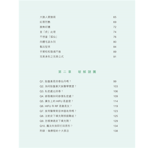 醫學美容一直是女士們很好奇的事物,功效神奇但又有不少古怪傳聞,一提起人人都有一大堆問題冒出來:激光脫毛有效嗎?果酸換膚會令皮膚變薄嗎?打肉毒桿菌素去了皺紋,停止療程會否立即變成酸梅乾?修陰機是甚麼?真的可令陰道回春?HIFU又是甚麼?要怎樣選擇?
