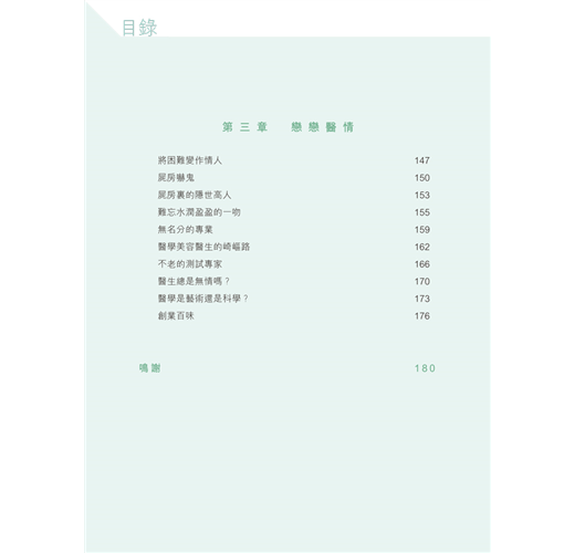 除了醫學美容知識之外,在本書的最後部分我為自己來一次回望,讓自己反思過去,重整未來。跟昔日醫學院的同窗提到正籌備這部書時,大家都表示很期待最後的章節,因踏足社會多年後,都很希望回味一下讀醫時的那些年。在這份珍貴的回憶裏,也確實流露了我們學醫生涯的點點滴滴,還有醫生鮮為人知的一些情、一些事。期望這些伴我成長的經驗、啟發和得着,能給有興趣讀醫的年輕人一點鼓勵,也讓他們一窺讀醫與行醫的實況。