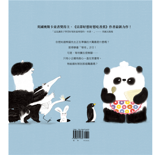 名人推薦:越是美好的事物往往越需要耐心等候,這對於缺乏耐性、總是說要就要的小小孩來說,就像那些不耐等候的羊駝、馬來貘、兔子和鶴的反應一樣,因為掉頭離開而錯失了美好的成果。但作者同樣也安排了一個反差的對應角色小企鵝,這樣的反差同樣產生值得和幼兒討論的因果關係。小企鵝從頭到尾一以貫之的「我願意等」,他的耐心等待是一種品格表現,也是一種謙恭的態度,不僅鼓舞了賣力做點心的熊貓先生,更讓自己最後終能獲得那個出人意表的大驚喜。