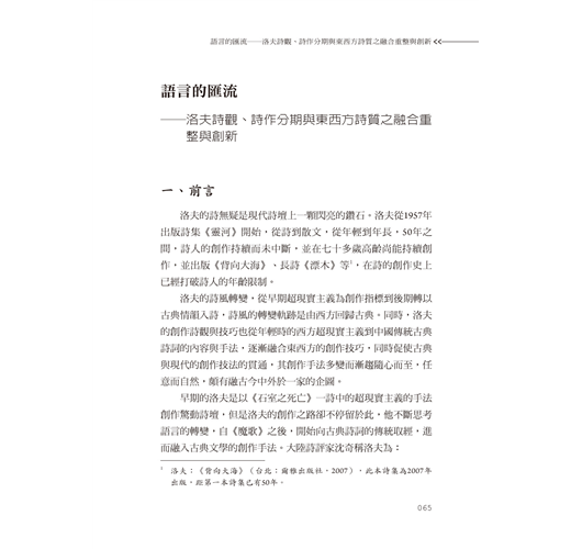 〈語言的匯流〉一篇是將洛夫詩歌的歷史分期分為四期,在前人研究成果分為三期之上,再多一個天涯美學時期,一方面從歷史的縱軸上看洛夫詩歌的演變結果,另一方面從橫軸上看洛夫詩歌在語言上的轉變、詩觀與創作的相證,以及洛夫詩歌中融合的中西方質素與呈現。