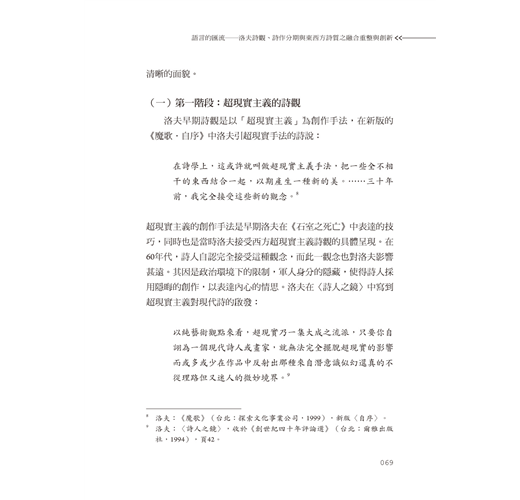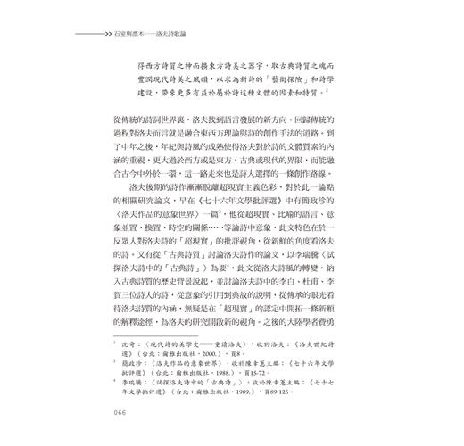接著進入詩的評論。理性的評論與純閱讀的驚喜必須劃開距離,站在較遠的地方看他的詩。洛詩如同他自稱的詩「魔」,有著眩人的魔力,一旦掉入漩渦的核心,就不自覺順著水流跟著詩的方向旋轉,雖說大自然的力量總是帶著一股英氣,源源不絕創建屬於造化的驚奇,然而,理論與研究必須特意將自己拉開中心點,找到高處的觀賞角度,並尋找可能的線索與條理,就這樣,我的研究論文在閱讀與批評中一點一...