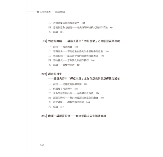 這本析論中的篇章,從開始到最後一篇,歷經約八、九年,出版之際再度修訂,這些文章在歲月中經過沉澱與再思考,經過生命的洗練與成熟,已經減少許多年少無知的誑語,同時,我在選擇論文題目時,盡量避免與前人研究的成果重複,而試圖在前人研究的夾縫中找尋遺珠,特別是許多學者研究過的主題,例如詩歌語言、詩歌意象、悲劇意識、莊與禪、歷史題材等,這些主題早已形成洛夫詩歌研究的主要範疇,而我則是力圖避免相同的題材或是類似的研究內容,雖然很難完全另闢蹊徑,卻仍希望站在前人成果之上再往前走,或者是在前人研究成果上試著從細部進行不同角度的深入研究。