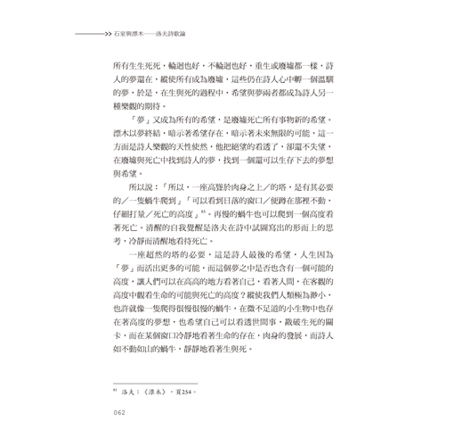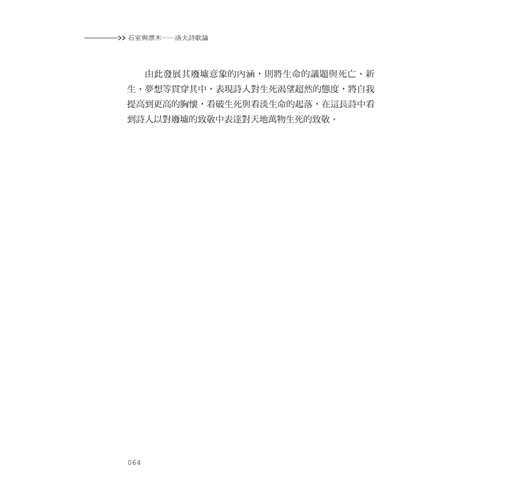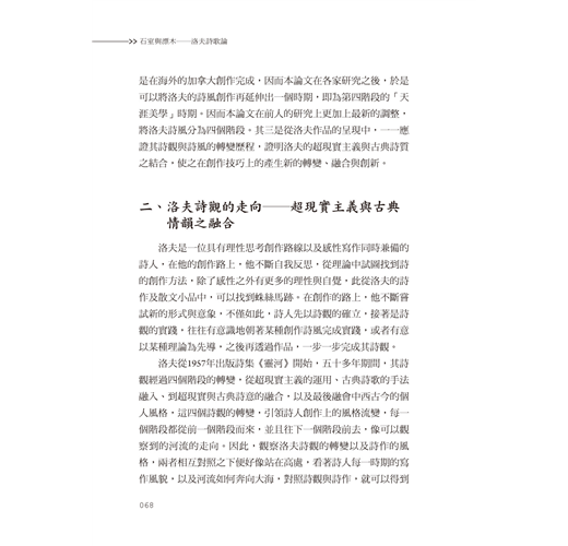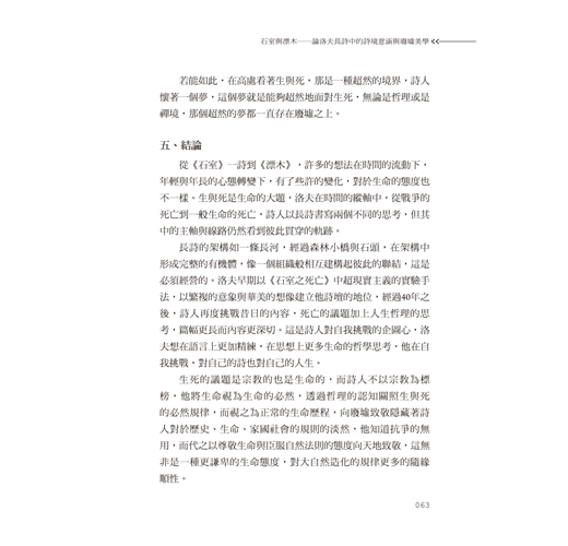 因此,本書中第一篇〈石室與漂木〉一文試圖從漂木與石室二詩的相對照中看出洛夫詩歌中的意涵與他長詩中展現的生命美學。一般論文是以漂木為研究對象,此文中提出長詩的寫作型式特色,並說明洛夫長詩的表現方法,從長詩的寫作中評析洛夫對於生命無常的感嘆。