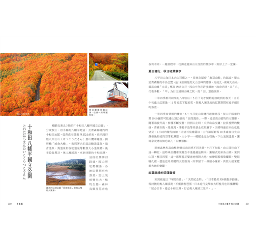 橫跨北東北3縣的「十和田八幡平國立公園」,分成秋田、岩手縣的八幡平地區,及青森縣境內的十和田地區,從青森市搭乘JR巴士前來,前半段行經八甲田山(はっこうださん)登山纜車處後、拱形橋「城倉大橋」,來到著名的混浴酸湯溫泉、猿倉溫泉、蔦溫泉和谷地溫泉等數個大小溫泉鄉。後半段從蔦沼、奧入瀨溪流,來到終點的十和田湖。這段紅葉夢幻路線,因山形地勢關係,各地紅葉期有些落差,加上氣候變化大,植物生態、森林鳥類及花卉也各有不同,一趟旅程中,彷彿走進深山大自然的奧妙中,好好上了一堂課。