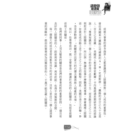 成就大事業的很多商界人士都意識到了人際關係對一個人成功的重要性。曾任美國某大鐵路公司總裁的A•H•史密斯說:「鐵路的百分之九十五是人,百分之五是鐵。」美國成人教育學家戴爾•卡內基經過長期研究得出結論說:「專業知識在一個人成功中的作用只占百分之十五,而其餘百分之八十五則取決於人際關係。」所以說,無論你從事什麼職業或專業,學會處理人際關係,你就在成功路上走了百分之八十五的路程。因此,美國石油大王約翰•D•洛克菲勒說:「我願意付出更大的代價去獲得與人相處的本領。」
