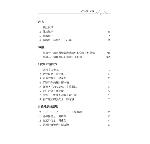 再來是導讀與序言的部分。本書的導讀部分由授課老師分別針對「敘事醫學與臨床倫理的交會」與「倫理書寫的意義」兩部分寫下導讀,希望能讓讀者較為快速掌握敘事案例閱讀的方法與其內在精神。導讀部分介紹了本課程教師評分的標準,正文案例的編排也是依據上述評分面向予以分類,包括:敘事表達能力、倫理脈絡呈現與倫理內涵品質三大面向,並盡可能附上教師的簡單說明,以幫助讀者們了解教師評量的內在過程。至於序言的部分,除了很榮幸邀請到課程進行時的醫學院顏正賢院長與醫學系陳彥旭主任作序,更感謝協同授課的高雄榮民總醫院陶宏洋醫師賜稿。顏院長與陳主任近幾年來的大力支持鼓勵,為我們帶來了良好的醫學人文授課環境。而高雄榮民總醫院陶宏洋醫師深厚的倫理素養,以及其打破階級與專業隔閡的開放胸懷,促成臨床與人文教師的長期合作,讓我們無形中進行了許多深度的學習。