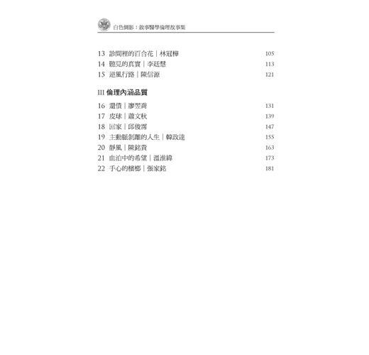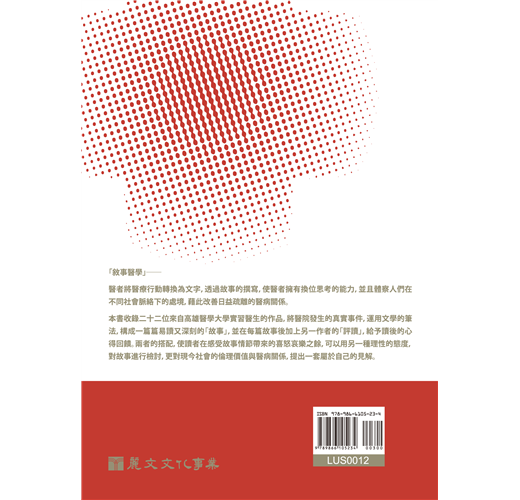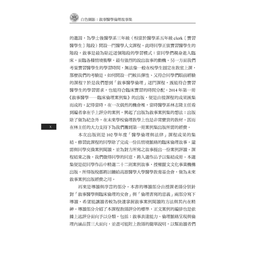 本次出版則是102 學年度「醫學倫理與法律」課程成果的集結。修習此課程的同學除了完成一份具情境脈絡的臨床倫理故事,還需與同學交換案例閱讀,並為對方所寫之故事提出一份案例評讀。課程結束之後,我們徵得同學的同意,將入選作品予以集結成冊。本選集便是從同學作品中精選二十二則案例故事,授權麗文文化事業機構出版,所得版稅都將回饋給高雄醫學大學醫學教育基金會,做為未來敘事案例出版經費之用。