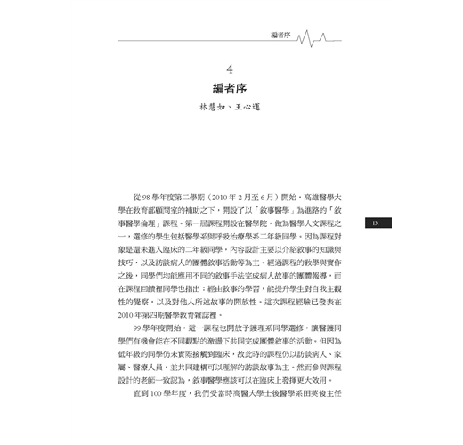 直到100 學年度,我們受當時高醫大學士後醫學系田英俊主任的邀請,為學士後醫學系三年級(相當於醫學系五年級clerk 階段)開設一門醫學人文課程。此時同學正值實習醫學生的階段,敘事是最為貼近這個階段的學習模式:當同學們親身進入臨床,面臨各種情境衝擊,最有強烈的說出故事的動機。另一方面我們考慮到實習醫學生的學習時間,無法像一般在校學生般固定在教室上課,那麼我們的考驗是,如何開設一門較具彈性、又符合同學們眼前經驗的課程?於是我們想到「敘事醫學倫理」這門課程,既能符合實習醫學生的學習需求,也能符合臨床實習的時間分配。2014 年第一冊《敘事醫學─臨床倫理案例集》的出版,便是由彼課程的成果匯集而成的。記得當時,在一次偶然的機會裡,當時醫學系林志隆主任看到編者拿在手頭上評分的案例,興起了出版為敘事案例集的想法:出版除了做為紀念外,在未來學校倫理教學上也是非常寶貴的教材。因而在林主任的大