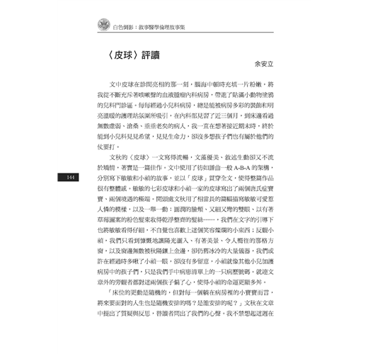 本書收錄二十二位來自高雄醫學大學實習醫生的作品,將活生生在醫院發生的事件,運用文學的筆法,構成一篇篇易讀又深刻的故事。每篇故事後再加上另一作者的評讀,給予讀後的心得回饋,加深醫療過程的深度與廣度,彷彿邀請讀者找出共鳴之處,進而與自己對話。