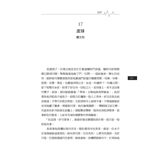 我遲到了。抓著白袍急急忙忙衝進醫院門診區,醫師的診間號碼已跳到四號。戰戰兢兢地敲了門,打開─迎面拋來一顆七彩皮球。銀鈴般的聲響清脆俐落地劃過門診區的種種哭鬧、呢喃、咳嗽、怒罵、哀聲、嘆息,也劃過時間之河,在這一秒鐘與下一秒鐘之間,留下短暫的永恆。我愣了好似有一世紀之久,皮球撞上,來不及反應的雙手、掉落、滾回敏敏腳邊。「學妹,去幫她做理學檢查。」我習慣性地用乾洗手液洗手,診間立即瀰漫一股人工香味,好似空氣也被消毒過,不帶任何微生物般,太乾淨到令人感到不適。手揮過敏敏面前時她...