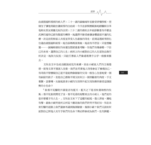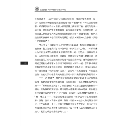 「床位的更動是隨機的,但對每一個躺在病房裡的小寶寶而言,將來要面對的人生也是隨機安排的嗎?是誰安排的呢?」文秋在文章中提出了質疑與反思,替讀者問出了我們的心聲。我不禁想起這週在血液腫瘤科看到的病人們:二十一歲的誠翰兩年前接受骨髓移植,控制住了讓他常跑加護病房的白血病,今天在診間裡靦腆地跟醫師分享他和女朋友到臺北玩的合照;三十二歲的倩如去年被診斷患有非霍金氏淋巴瘤時已經有腦部的轉移,她選擇不接受會讓身體虛弱不適的化療,決定出院和家人共度並享受人生最後的時光,直到這週病情惡化住進血液腫瘤科病房,她告訴媽媽要勇敢,她沒有不舒服,只是想睡覺⋯⋯。誠翰和倩如的命運也歷經重重考驗,但他們有機會賭一下自己的未來,選擇自己的人生;病床上的小禎對自己的人生卻無法做任何決定,她無力反抗,只能任憑家人們像處理燙手山芋一般推來推去。