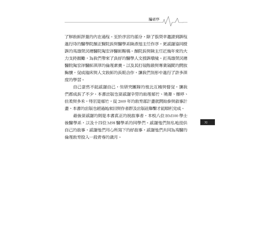 最後要感謝的則是本書真正的說故事者,本校BM100 學士後醫學系八位,以及十四位M98 醫學系的同學們。感謝他們無私地提供自己的故事,感謝他們用心所寫下的好故事,感謝他們共同為高醫的倫理教育投入一段青春的歲月。