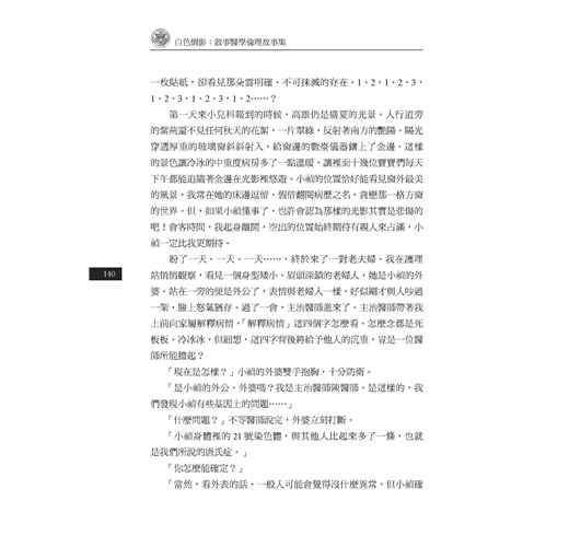 其實小禎在出生之前,是兩個家庭搶著要的掌上明珠。雙方並未成婚,但都想爭取這個孩子的扶養權。當小禎出生被診斷出異常之後,就再也不見任何一方來探望小禎。只有外公、外婆,以及他們眉間的憤怒、眼裡的哀傷、肩上的無奈。她就像顆皮球,父親踢給母親,母親丟給祖父母,祖父母想把她留在醫院,丟給社會。我望著小禎和她祖父母的身影融入窗外那片由橙轉紅再轉紫的霞裡,周遭的聲音漸漸淡去,只見小禎祖父母的面容扭曲,憤怒的嘴無聲地一張一合,而陳醫師的臉也越來越顯疲憊不耐。唯有小禎,仍然甜甜地睡著,呼吸緩慢而均勻。看著小禎外婆臉上掛著兩行淚、眉間的怒氣一絲不減,緊抱胸的雙手微微顫抖,起先我感到憤怒,後來是同情,最後是對人世間這令人無奈的親情悲劇感到哀傷。換個角度想,他們真是在推卸責任嗎?他們面對的是掙扎、煎熬、困難的人生抉擇。我憑什麼評斷他們?