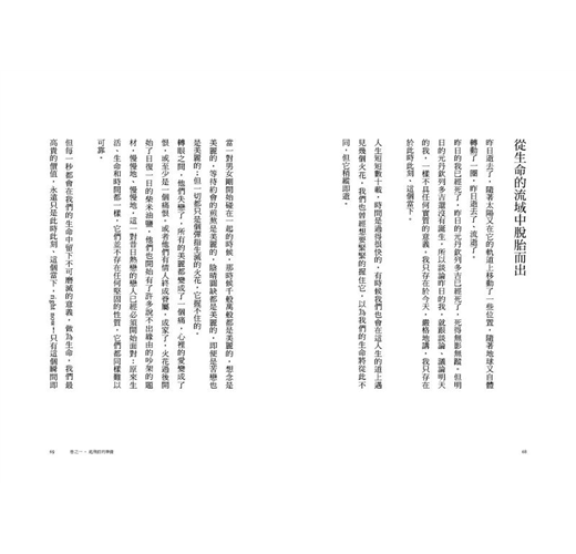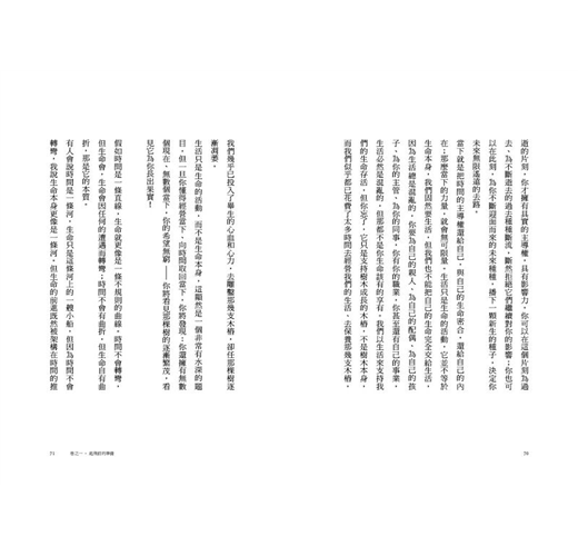 只是一秒,一秒可以什麼事都不發生,一秒也可以發生很多事、可以翻轉整個世界。無論你多麼英明睿智,這一秒都不會先來跟你討論,你也不會有任何機會可以跟它商量,你不會得到它對你的請示,甚至暗示,然後它就來了,然後它就讓人倒下;它不會管你的才華出眾、豐功偉業、遠大前程、頭銜地位、身家財產,你的健康會在那一秒之間,讓這些全部都變成毫無意義的廢物,包括我們自己;所有這一切我們原本捨不得的,都將被迫放下 —— 但我們必須等到這一秒才要不得不放開嗎?