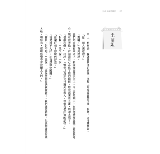 「好啊。」她說,把書闔上,封面朝上放在錢包旁邊。《蜜月殺機》,作者是派翠西亞.海史密斯。