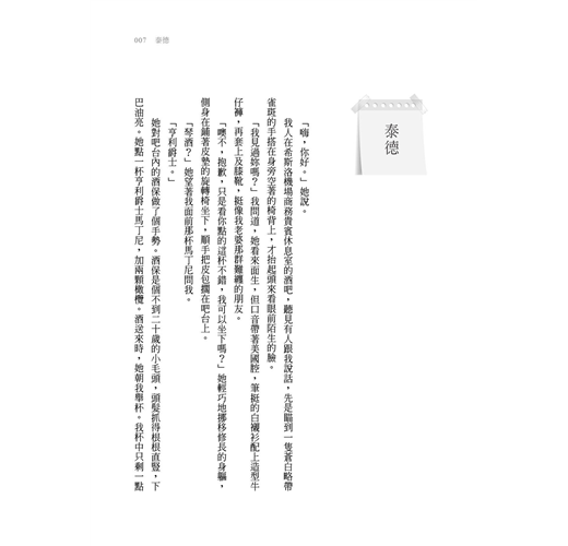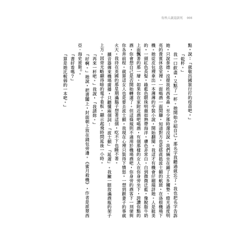 「沒聽過這人。」我擠出笑容,把別人的名言當作自己講的話,多少感到有點心虛。這時酒保赫然出現在我面前,我又點了一杯。嘴巴周圍的皮膚開始產生愉悅的麻木感──幾杯琴酒下肚後往往如此──我知道自己很快就要酩酊大醉,講太多話,不過這是機場規則不是嗎?雖說她住的地方離我只有三十多公里遠,但我早就忘記她叫什麼,更別提這輩子再遇到她的可能性微乎其微。何況跟陌生人喝著酒、談談講講的感覺真是好。光是大聲說話,就能驅散不少我內心的憤怒。