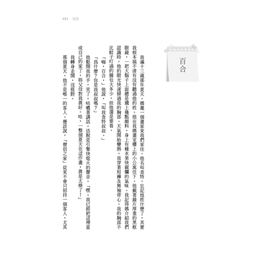 「我見過妳嗎?」我問道,她看來面生,但口音帶著美國腔,筆挺的白襯衫配上造型牛仔褲,再套上及膝靴,挺像我老婆那群難纏的朋友。