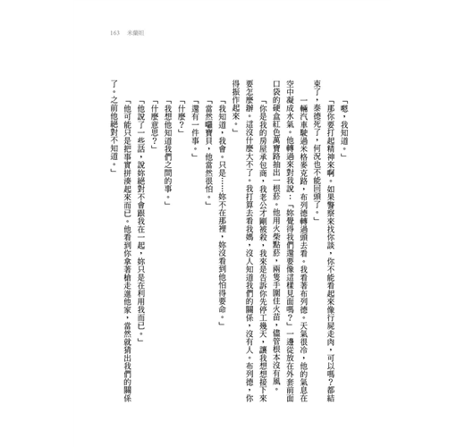 布列德跟米蘭妲帶我參觀房子,布列德談講建材的事,米蘭妲告訴我哪一樣家具要擺哪兒,我不禁想方才的事會不會是我想歪了。兩個人跟我說話時,都沒有顯出特別緊張的樣子。或許他們只是變成好朋友,就是那種會互相打氣、合抽一根菸的朋友。米蘭妲不吝於表達情感,也不避忌肢體碰觸,她會勾住女生朋友的臂彎,跟我們的男性朋友打招呼或道別時,親吻他們的嘴唇。我突然想,搞不好是我太大驚小怪了。