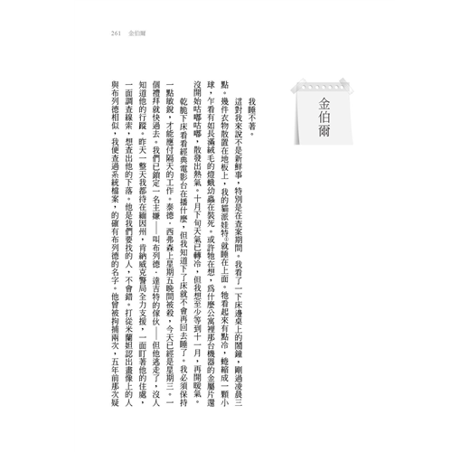 其實那時我就覺得兩人關係有點變質。晚餐才吃到一半,就已經沒話講了,也不再同時上床睡覺。更重要的是,我們都變了,不再是當初結合時的那個人。剛相識時我是有錢的生意人,教她品嘗昂貴的酒,帶她參加慈善晚宴,而她是灑脫不羈的藝術家,空閒時訂張機票去泰國海灘,愛去平價酒吧流連。我知道我們倆非常不配,就像通俗劇常見的那樣,但我們合得來,每一方面都完全合拍。我認為自己算好看,而且是大部分人承認的那種帥,但只要我跟她在一起,沒人會看我—就連這點我也喜歡。她腿長胸部大,雙唇飽滿,一張心形臉蛋十分精緻。頭髮是深咖啡色,但她總把它染黑。她會刻意把頭髮弄蓬,一副才剛起床的模樣。她皮膚非常好,根本不需要化妝品,但她非得畫上黑眼線才肯出門。在酒吧或餐廳時,我看到男人目不轉睛盯著她,或許這只是我內心想法的投射,但他們看著她的表情實在是飢渴又原始。我覺得慶幸,至少我不是活在男人習慣身上帶著武器的時代或地區。
