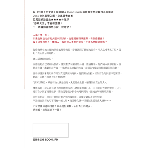 ★與《列車上的女孩》同時闖入Goodreads年度最佳懸疑驚悚小說票選