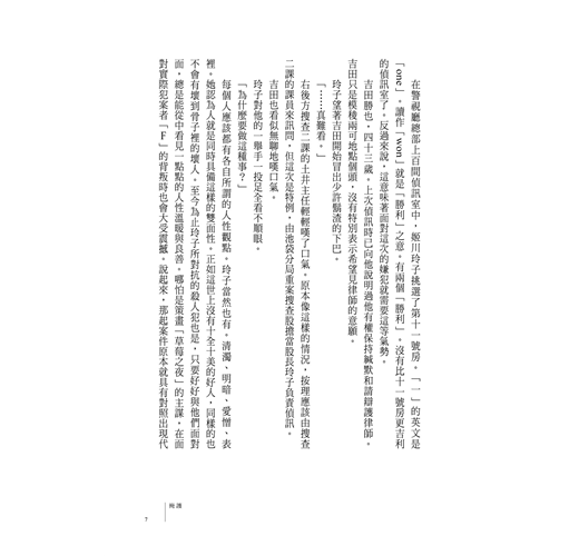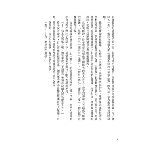 雖然這種說法很極端,但玲子一直認為,所謂的偵訊行為,應該要站在與犯意完全相反的位置,試圖接近犯罪者的心理、以及找出犯罪動機的核心。是因愛生恨?是要擺脫厄運?或是逃避擺脫不了的念頭?就好像衝動的擺錘。玲子相信,只要看出擺錘的軌跡,就能找到解開嫌犯心理的那把鑰匙。