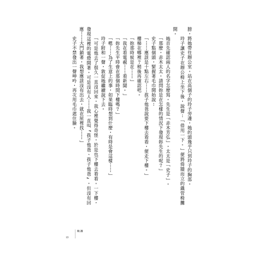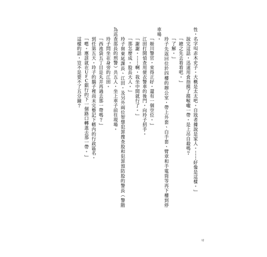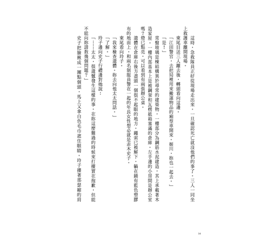 然而現階段,玲子在這名叫做吉田勝也的男人身上,看不到那種有可能成為線索的擺錘。「黑暗」的另一頭沒有「光明」。「憎恨」的另一面沒有「愛」。她只抱有這樣籠統的印象。