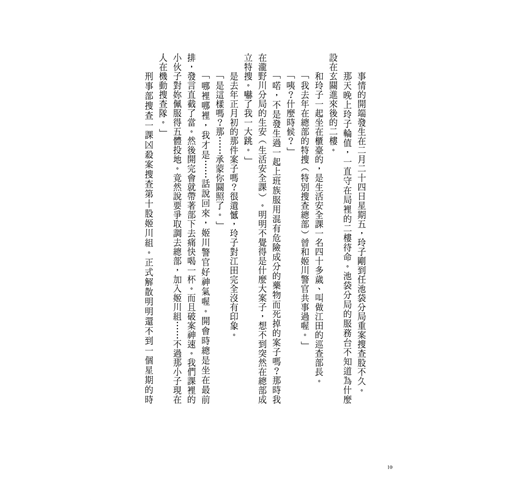 右後方搜查二課的土井主任傳來淺淺的吐息聲。原本像這樣的情況,按理應該由搜查二課的課員來訊問,但這次是特例,由池袋分局重案搜查股的股長玲子負責偵訊。